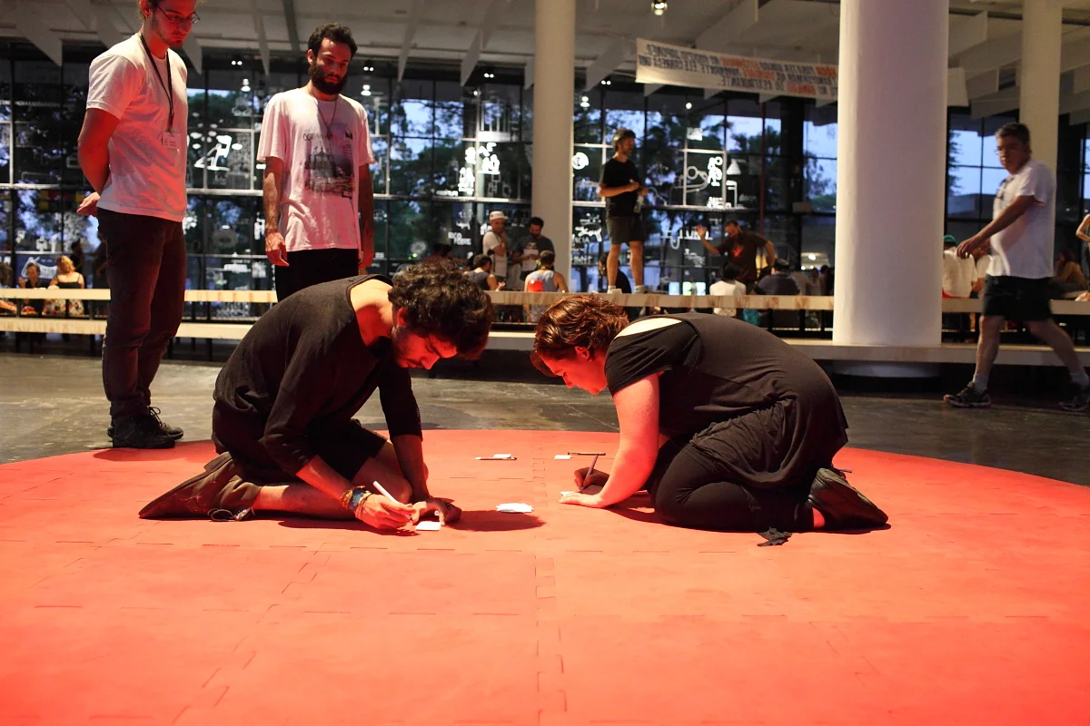 Notes on Not-Knowing is a two person telepathic engagement that Honi and I developed in early August 2014 in Berlin. And now we brought it with us to the Sao Paulo Bienale for the Perpendicular Bienale Intervention. The text based work demands silence, and focus on the connection between two people. The nature of this work is the kind that doesn't cease to surprise amuse and humilify its participants. For the first time, we opened the piece to the passer by- and let people try their telepathic abilities (paired perhaps with chance and coincidence). What emerges is something between a poetic and fragmented text with moments of harmony - a series of moments shared as a connection, embodied in a text. (click the image for documentation) and here for a link to Honi's blog; documentation of the first time we did 'Notes' in Berlin.